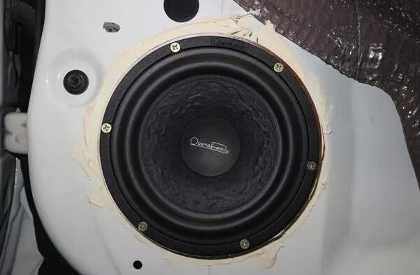 下圖為套裝喇叭的中低音安裝在門板上的特寫(xiě),這樣既美觀,又可以達(dá)到更佳的效果。