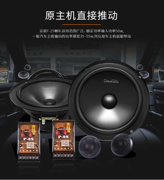 歌劇世家F-25兩分頻套裝喇叭安裝在前聲場(chǎng),這套喇叭在推出市場(chǎng)后不久就獲得了發(fā)燒友的認(rèn)可,它的中低音沉穩(wěn),高音透亮,而且全部是原位安裝,無(wú)損升級(jí),備受青睞!