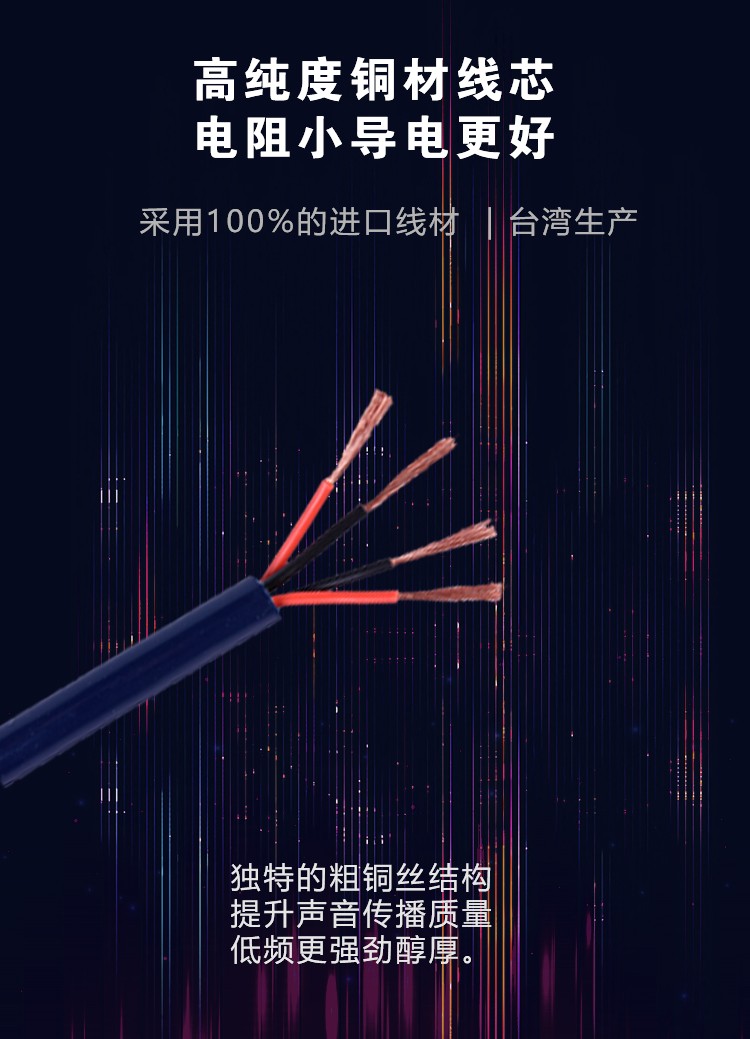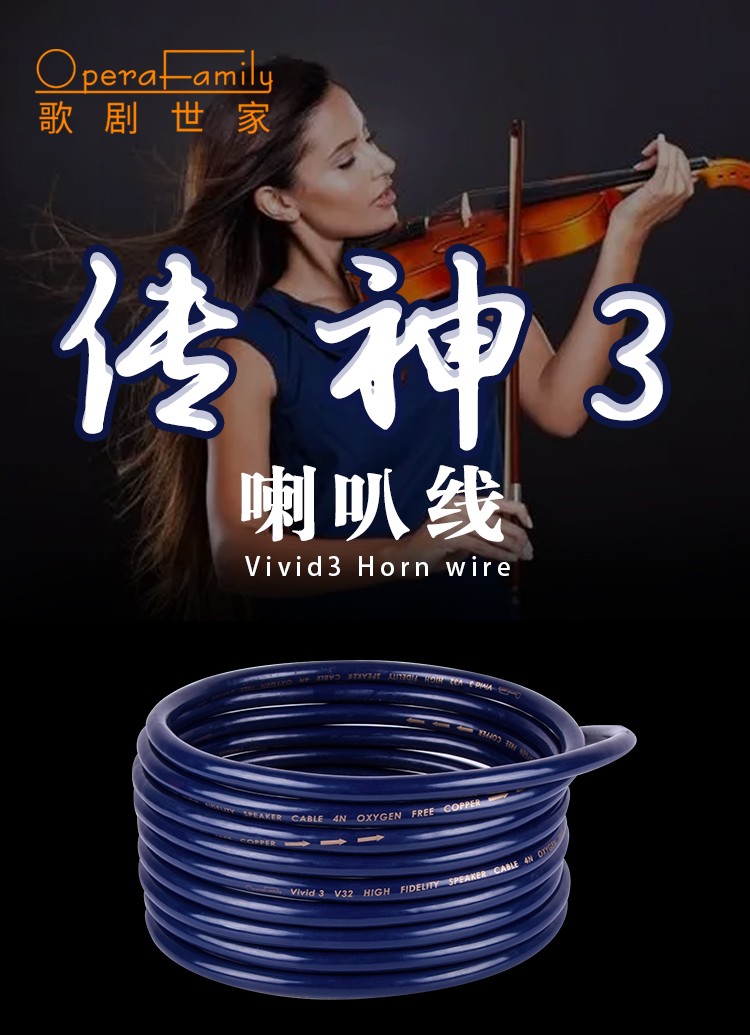 vivid 3.2 4N OFC,13#,2芯喇叭線,5米,2條/盒 vivid3.4 4N OFC,13#,4芯喇叭線,3米,2米/盒 歌劇世家vivid3喇叭線,是100%的線材,4N OFC純銅多股緊密對(duì)焦傳輸,保證聲音穩(wěn)定真實(shí)的傳輸還原性。高純度銅材線芯,電阻小導(dǎo)電性更好。 獨(dú)特粗銅絲結(jié)構(gòu),提升聲音傳播質(zhì)量,低頻更強(qiáng)勁醇厚。 全頻平衡度好,聲音密度質(zhì)感好,還原音樂每個(gè)細(xì)節(jié)。