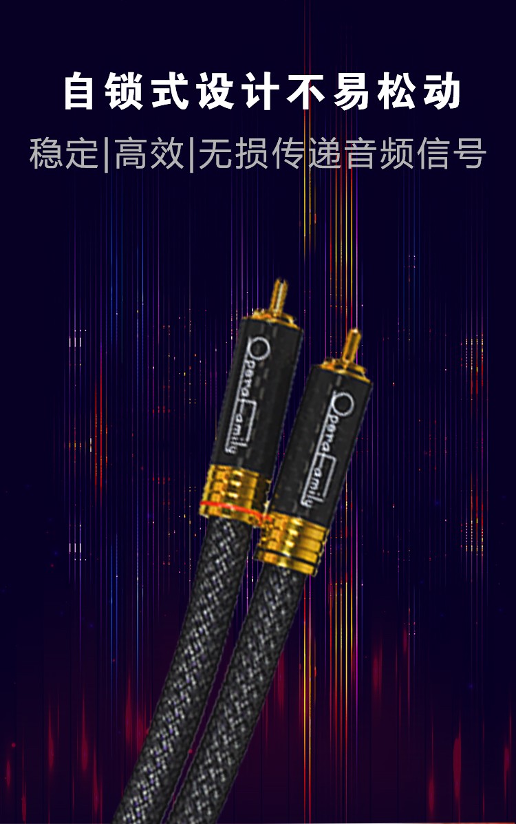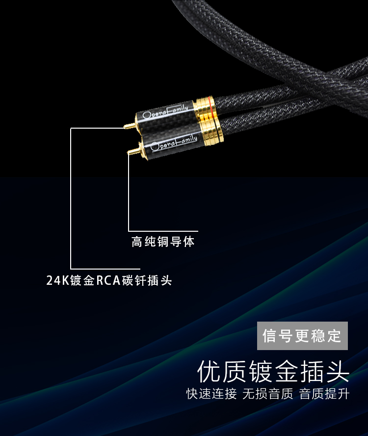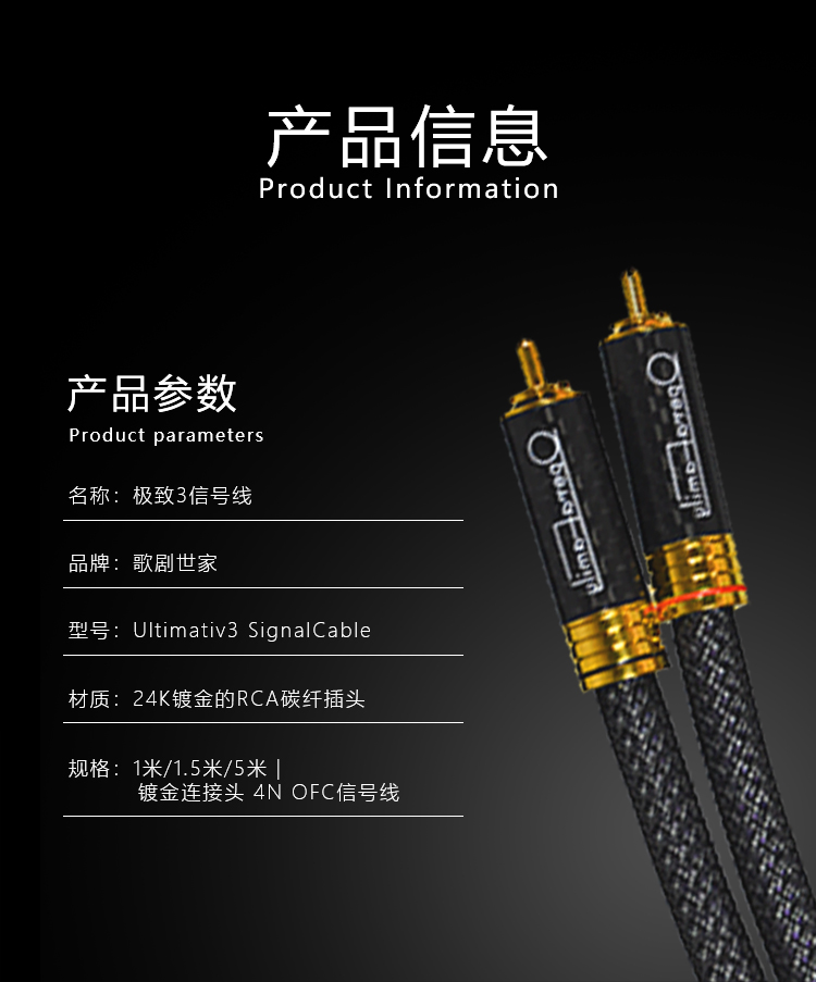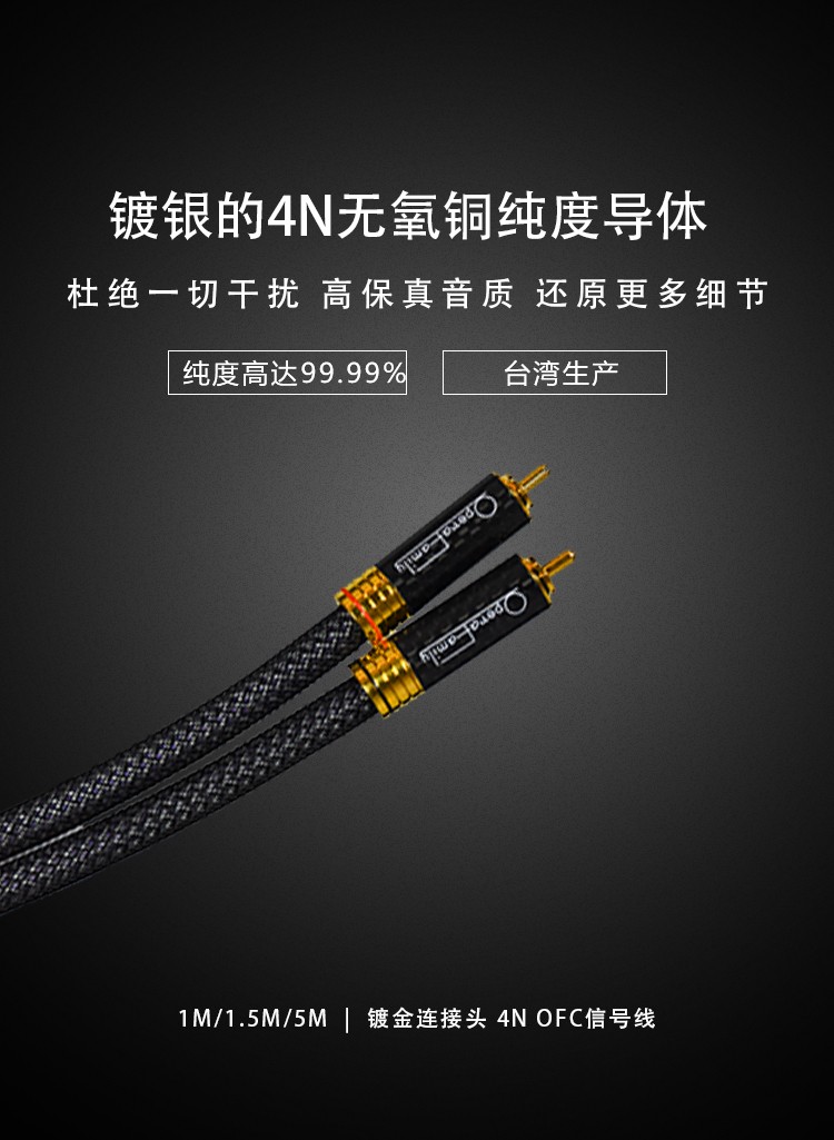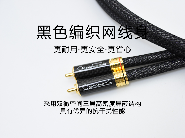 規(guī)格:1m、1.5m、5m 鍍金連接頭 4N OFC信號線 歌劇世家極致3信號線導(dǎo)體采用鍍銀的4N無氧銅純度導(dǎo)體,純度高達(dá)99.9%,24k鍍金的RCA碳纖插頭,自鎖式設(shè)計(jì)不易松動,能夠穩(wěn)定、高效、無損的傳遞音頻信號。 5米那條信號線 則采用雙微空間三層高密度屏蔽結(jié)構(gòu),具有優(yōu)異的抗干擾性能。高頻具有更好的延伸,中頻密度感好,低頻快速有力。