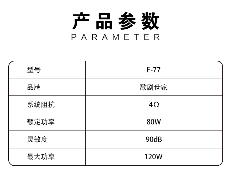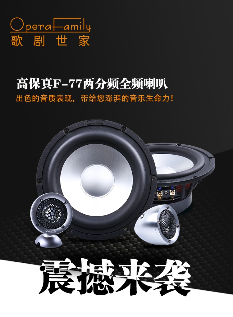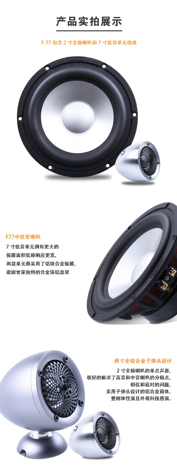 歌劇世家F-77全頻兩分頻喇叭:產(chǎn)品由2寸全頻喇叭和7寸低音單元組成。2寸全頻喇叭單元的單點(diǎn)聲源,很好地解決了高音和中音喇叭的分頻點(diǎn)、相位和延時(shí)等問題。全頻喇叭單元?jiǎng)t采用了子彈頭設(shè)計(jì)的鋁合金箱體,整體剛性強(qiáng)且外觀科技感強(qiáng)。7寸低音單元擁有更大的振膜面積,低頻響應(yīng)更寬。兩款單元都采用了歌劇世家獨(dú)家的鋁鎂合金振膜和合金鑄鋁盆架。 產(chǎn)品參數(shù):額定功率:80W / 最大功率:120W / 靈敏度:90dB / 系統(tǒng)阻抗:4Ω