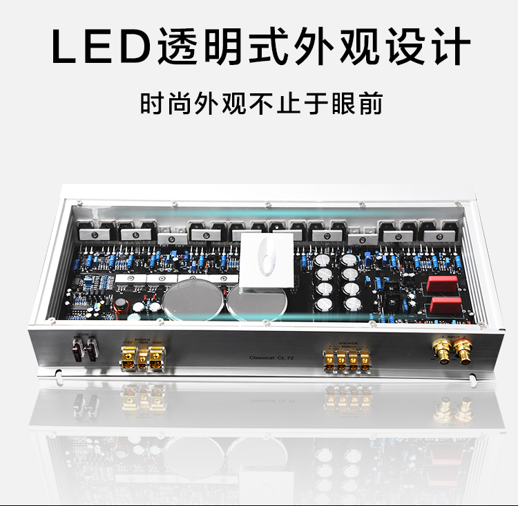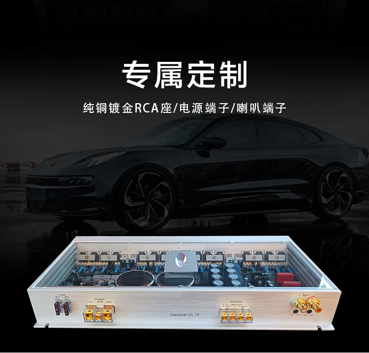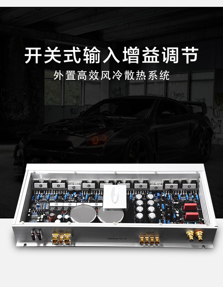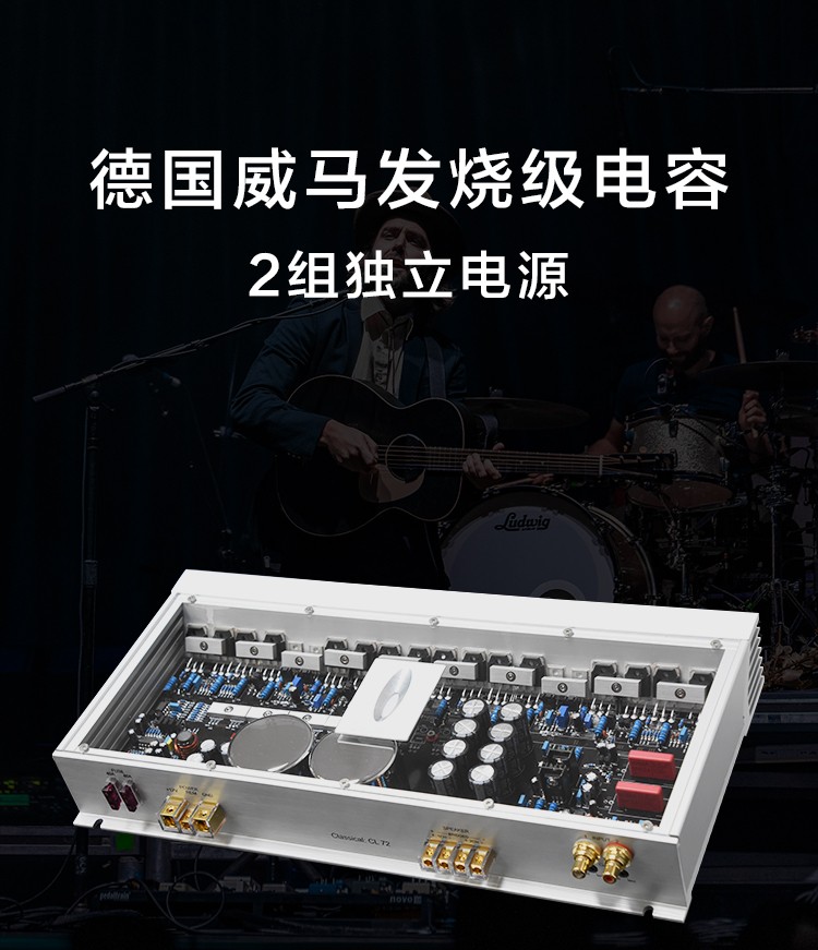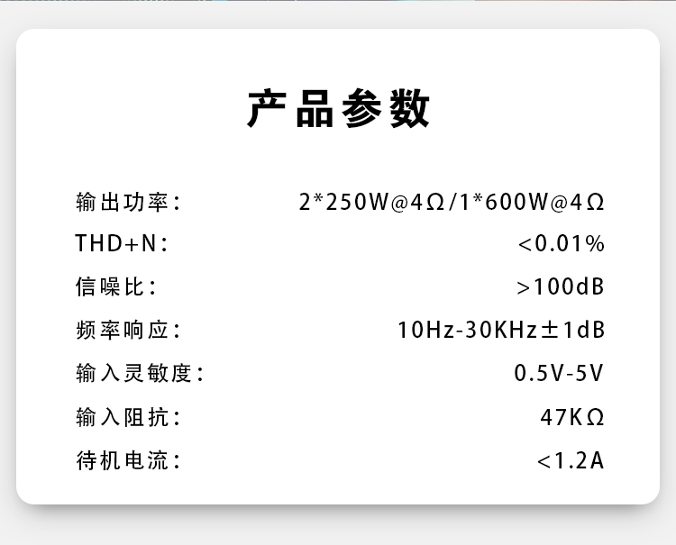兩組獨立電源;定制純銅鍍金RCA座、電源端子、喇叭端子;德國威瑪發(fā)燒級電容;LED透視式外觀設(shè)計;開關(guān)式輸入增益調(diào)節(jié);外置高效風冷散熱系統(tǒng)。 輸入功率:2x250W@4歐姆/1x600W@4歐姆 THD+N:<0.01% 信噪比:>100dB 頻響范圍:10Hz-30kHz±1dB 輸入靈敏度:0.5V-5V 輸入阻抗:47KΩ 待機電流:<1.2A