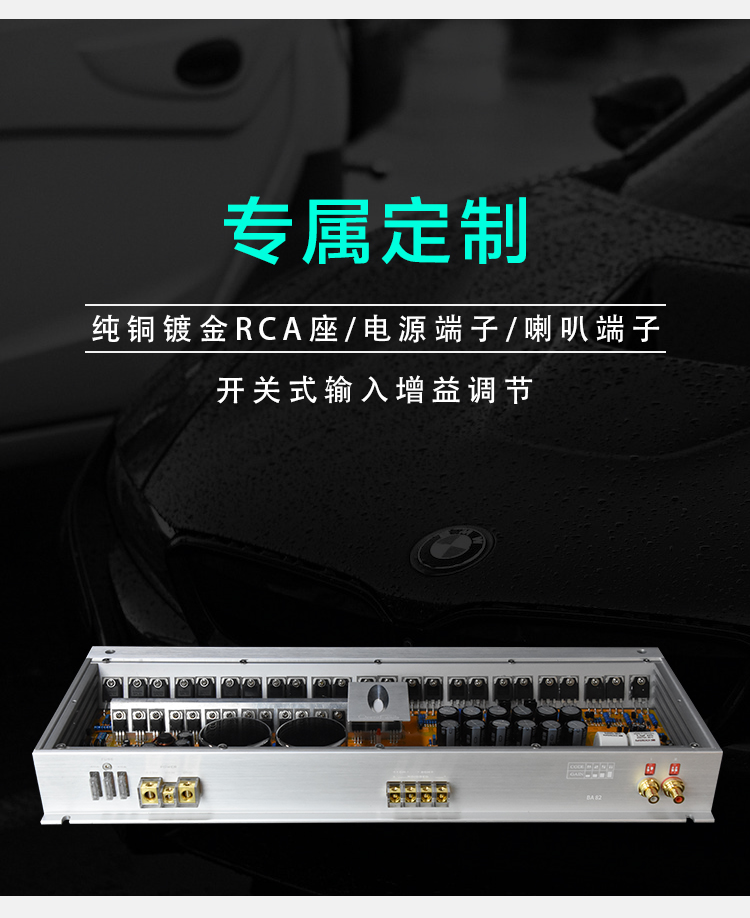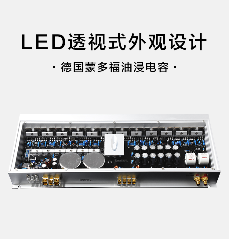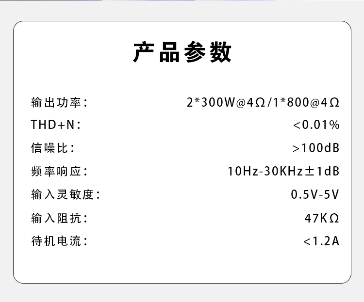 雙單聲道式設(shè)計;定制純銅鍍金RCA座、電源端子、喇叭端子;德國蒙多福油浸電容;LED透視式外觀設(shè)計;開關(guān)式輸入增益調(diào)節(jié);外置高效風(fēng)冷散熱系統(tǒng)。 輸入功率:2x300W@4Ω/1x800W@4Ω THD+N:<0.01% 信噪比:>100dB 頻響范圍:10Hz-30KHz±1dB 輸入靈敏性:0.5V-5V 輸入阻抗:47kΩ 待機電流:<1.2A