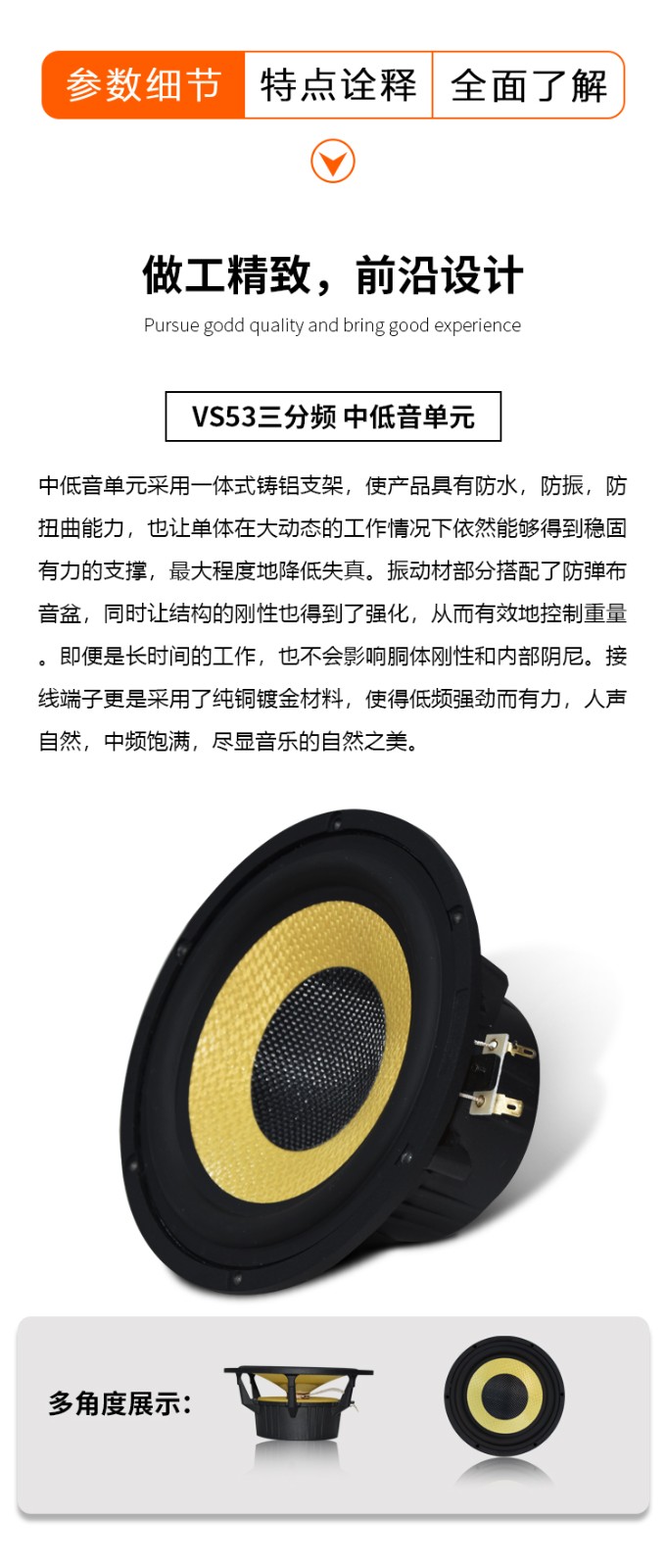 靈敏度:90dB / 系統(tǒng)阻抗:4Ω / 額定功率:70W / 最大功率:140W / 頻響范圍:50Hz-20kHz 高音采用25芯德國球頂絲膜,CNC全鋁外殼及鍍金銅接線端子; 中音喇叭,防彈布音盆,高強度一體式鑄鋁支架,鍍金純銅接線端子; 6.5寸低音喇叭,防彈布音盆,高強度一體式鑄鋁支架,鍍金純銅接線端子; 分頻器精選發(fā)燒級元件及防爆裂的優(yōu)質(zhì)透明亞克力蓋; 歌劇世家專利喇叭罩。